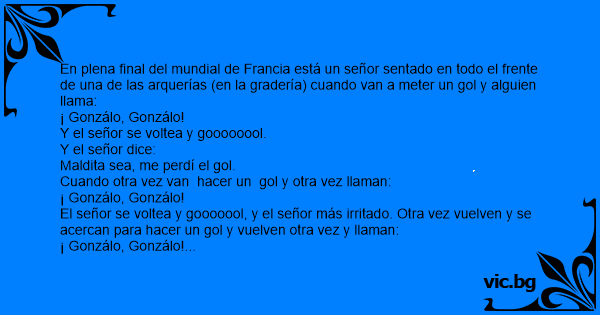 En plena final del mundial de Francia está un señor sentado en todo el frente de una de las arquerías (en la gradería) cuando van a meter un gol y alguien llama: