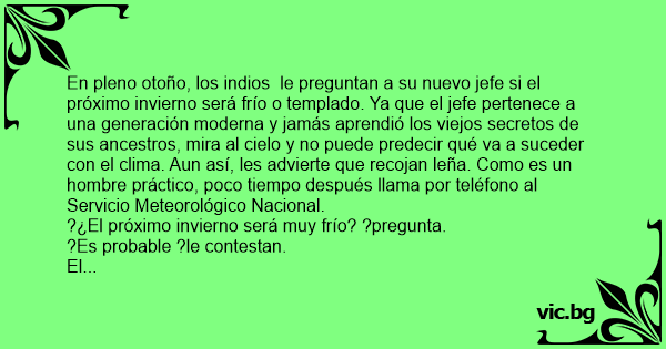 En pleno otoño, los indios le preguntan a su nuevo jefe si el próximo invierno será frío o templado. Ya que el jefe pertenece a una generación moderna y jamás aprendió los viejos secretos de sus ancestros, mira al cielo y no puede predecir qué va a suceder соn el clima. Aun así, les advierte que recojan leña. Como es un hombre práctico, poco tiempo después llama por teléfono al Servicio Meteorológico Nacional.