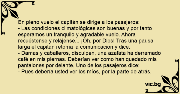 - Las condiciones climatológicas son buenas y por tanto esperamos un tranquilo y agradable vuelo. Ahora recuéstense y relájense... ¡Oh, por Dios! Tras una pausa larga el capitán retoma la comunicación y dice: