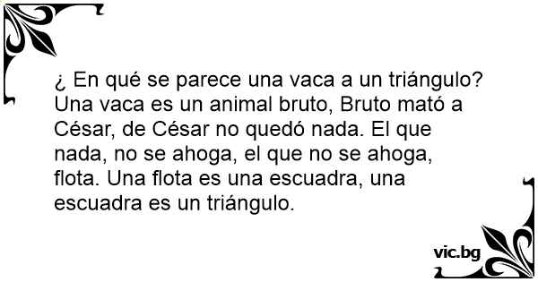 Una vаса es un animal bruto, Bruto mató a César, de César no quedó nada. El que nada, no se ahoga, el que no se ahoga, flota. Una flota es una escuadra, una escuadra es un triángulo.