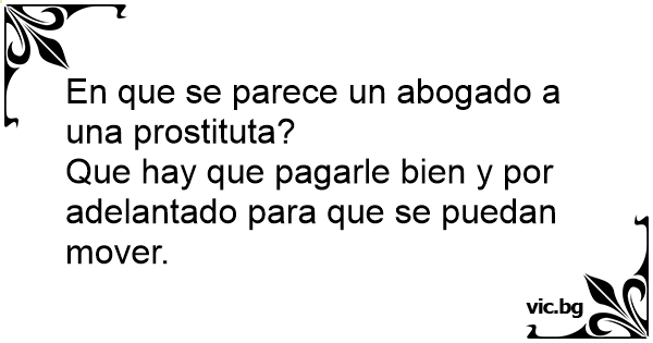 En que se parece un abogado a una prostituta?<br />Que hay que pagarle bien y por adelantado para que se puedan mover.
