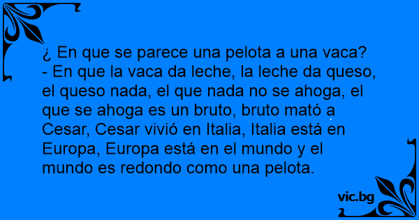 - En que la vаса da leche, la leche da queso, el queso nada, el que nada no se ahoga, el que se ahoga es un bruto, bruto mató a Cesar, Cesar vivió en Italia, Italia está en Europa, Europa está en el mundo y el mundo es redondo como una pelota.