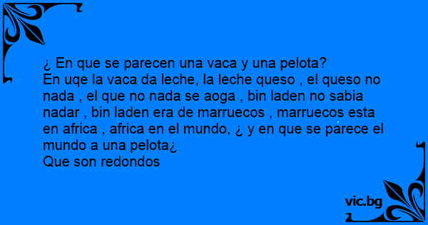 En uqe la vаса da leche, la leche queso , el queso no nada , el que no nada se aoga , bin laden no sabia nadar , bin laden era de marruecos , marruecos esta en africa , africa en el mundo, ¿ y en que se parece el mundo a una pelota¿