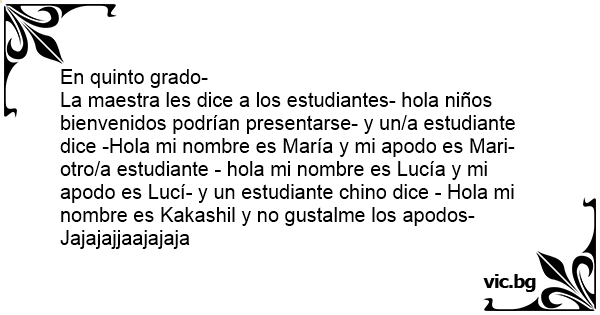 La maestra les dice a los estudiantes- hola niños bienvenidos podrían presentarse- y un/a estudiante dice -Hola mi nombre es María y mi apodo es Mari- otro/a estudiante - hola mi nombre es Lucía y mi apodo es Lucí- y un estudiante chino dice - Hola mi nombre es Kakashil y no gustalme los apodos-
