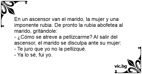 En un ascensor van el marido, la mujer y una imponente rubia. De pronto la rubia abofetea al marido, gritándole: