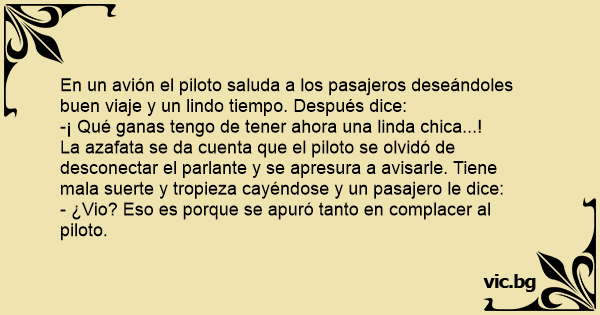 En un avión el piloto saluda a los pasajeros deseándoles buen viaje y un lindo tiempo. Después dice: