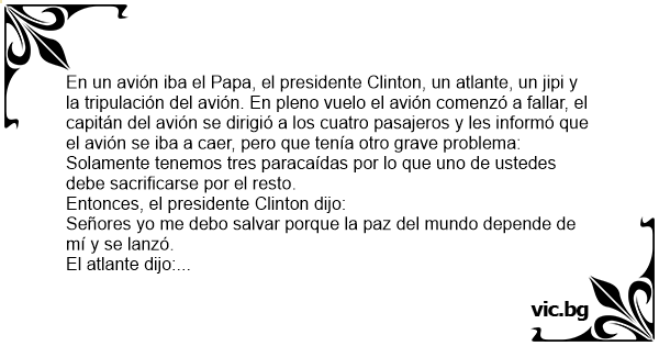 En un avión viaja Ronaldo, la mujer de Bush, Bush, el papa y un niño. Aparece un cartel "Atención, sobre peso, sobre peso" Y Ronaldo dice: - Yo como soy un jugador muy bueno me tengo que salvar....