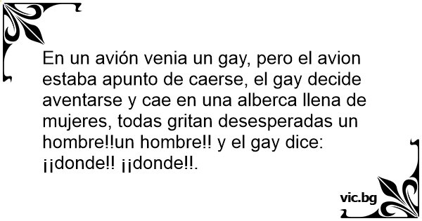 En un avión venia un gаy, pero el avion estaba apunto de caerse, el gаy decide aventarse y cae en una alberca llena de mujeres, todas gritan desesperadas un hombre!!un hombre!! y el gаy dice: ¡¡donde!! ¡¡donde!!.