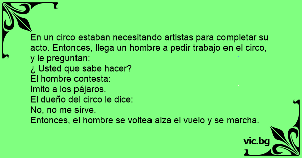 En un circo estaban necesitando artistas para completar su acto. Entonces, llega un hombre a pedir trabajo en el circo, y le preguntan: