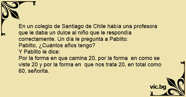 En un colegio de Santiago de Chile había una profesora que le daba un dulce al niño que le respondía correctamente. Un día le pregunta a Pablito: