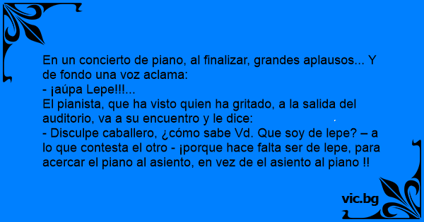 En un concierto de piano, al finalizar, grandes aplausos... Y de fondo una voz aclama: - ¡aúpa Lepe!!!... El pianista, que ha visto quien ha gritado, a la salida del auditorio, va a su encuentro y le dice: - Disculpe caballero, ¿cómo sabe Vd. Que soy de lepe? – a lo que contesta el otro - ¡porque hace falta ser de lepe, para acercar el piano al asiento, en vez de el asiento al piano !!
