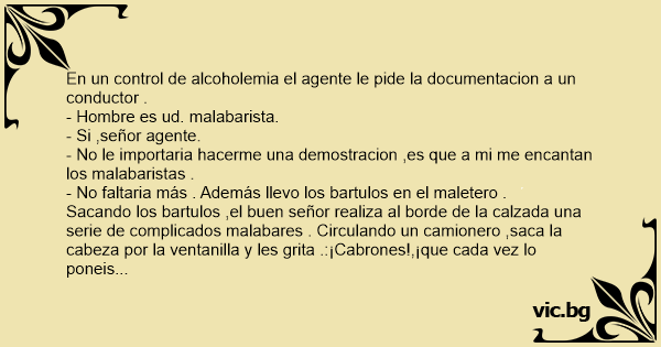 Sacando los bartulos ,el buen señor realiza al borde de la calzada una serie de complicados malabares . Circulando un camionero ,saca la cabeza por la ventanilla y les grita .:¡Cabrones!,¡que cada vez lo poneis más dificil!