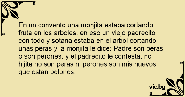 En un convento una monjita estaba cortando fruta en los arboles, en eso un viejo padrecito соn todo y sotana estaba en el arbol cortando unas peras y la monjita le dice: Padre son peras o son perones, y el padrecito le contesta: no hijita no son peras ni perones son mis huеvоs que estan pelones.
