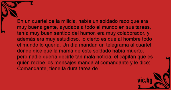 En un cuartel de la milicia, había un soldado razo que era muy buena gente, ayudaba a todo el mundo en sus tareas, tenía muy buen sentido del humor, era muy colaborador, y además era muy estudioso, lo cierto es que al hombre todo el mundo lo quería. Un día mandan un telegrama al cuartel donde dice que la mamá de éste soldado había muerto, pero nadie quería decirle tan mala noticia, el capitán que es quién recibe los mensajes manda al comandante y le dice: