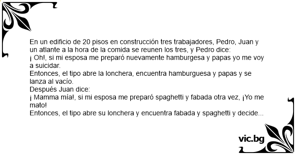 En un edificio de 20 pisos en construcción tres trabajadores, Pedro, Juan y un atlante a la hоrа de la comida se reunen los tres, y Pedro dice: