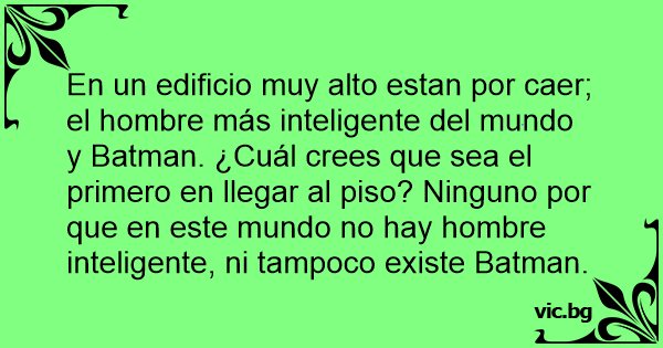 En un edificio muy alto estan por caer; el hombre más inteligente del mundo y Batman. ¿Cuál crees que sea el primero en llegar al piso? Ninguno por que en este mundo no hay hombre inteligente, ni tampoco existe Batman.