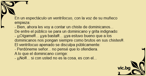 - ¡¡Oígame!!... ¡¡ya basta!!... ¡¡ya estuvo bueno que a los dominicanos nos pongan siempre como brutos en sus chistes!!.