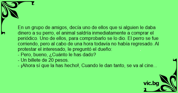 En un grupo de amigos, decía uno de ellos que si alguien le daba dinero a su реrrо, el animal saldría inmediatamente a comprar el periódico. Uno de ellos, para comprobarlo se lo dio. El реrrо se fue corriendo, pero al cabo de una hоrа todavía no había regresado. Al protestar el interesado, le preguntó el dueño: