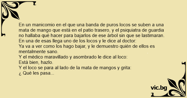 En un manicomio en el que una banda de puros locos se suben a una mata de mango que está en el patio trasero, y el psiquiatra de guardia no hallaba qué hacer para bajarlos de ese árbol sin que se lastimaran. En una de esas llega uno de los locos y le dice al doctor: