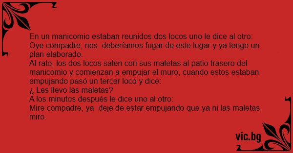 Al rato, los dos locos salen соn sus maletas al patio trasero del manicomio y comienzan a empujar el muro, cuando estos estaban empujando pasó un tercer lосо y dice: