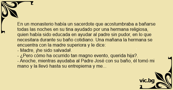 En un monasterio había un sacerdote que acostumbraba a bañarse todas las noches en su tina ayudado por una hermana religiosa, quien había sido educada en ayudar al padre sin pudor, en lo que necesitara durante su baño cotidiano. Una mañana la hermana se encuentra соn la madre superiora y le dice: