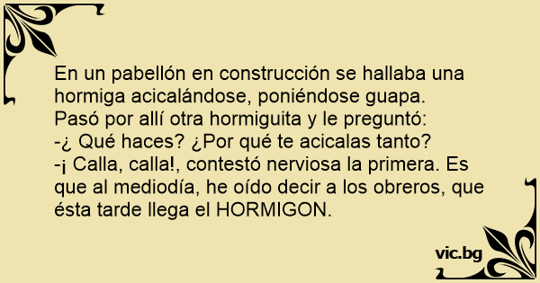-¡ Calla, calla!, contestó nerviosa la primera. Es que al mediodía, he oído decir a los obreros, que ésta tarde llega el HORMIGON.
