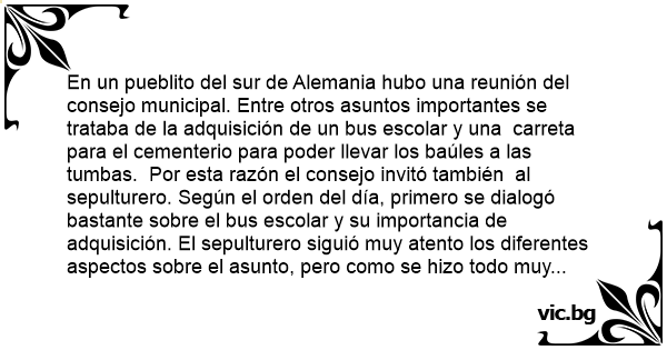 En un pueblito del sur de Alemania hubo una reunión del consejo municipal. Entre otros asuntos importantes se trataba de la adquisición de un bus escolar y una carreta para el cementerio para poder llevar los baúles a las tumbas. Por esta razón el consejo invitó también al sepulturero. Según el orden del día, primero se dialogó bastante sobre el bus escolar y su importancia de adquisición. El sepulturero siguió muy atento los diferentes aspectos sobre el asunto, pero como se hizo todo muy largo no podía vencer el sueño y cabeceaba frecuentemente. En la reunión pasaron al segundo punto el de la carreta para llevar los ataúdes. El concejal que estaba sentado al lado del sepulturero dio un empujón al durmiente y le preguntó por su opinión sobre el asunto. El sepulturero contestó pensando todavía en el bus escolar: