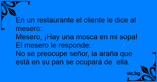 Komt een man in een restaurant en zegt ber,er zit een vlieg in mijn soep. Zegt de ober:Niet voor lang. Ziet u die spin aan de rand van uw bord?
