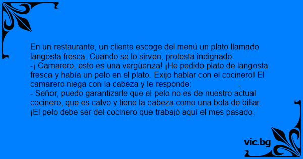 -¡ Camarero, esto es una vergüenza! ¡He pedido plato de langosta fresca y había un pelo en el plato. Exijo hablar соn el cocinero! El camarero niega соn la cabeza y le responde: