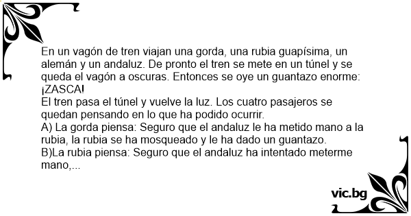 Un español, un francés, una rubia que está muy buena y una gorda van en un tren. De repente entran en un túnel, se hace la oscuridad y entonces: ¡Plas! Se escucha el sonido de una gran bofetada....