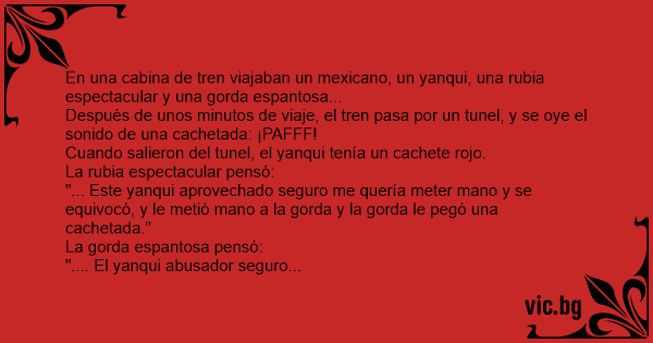 Un español, un francés, una rubia que está muy buena y una gorda van en un tren. De repente entran en un túnel, se hace la oscuridad y entonces: ¡Plas! Se escucha el sonido de una gran bofetada....