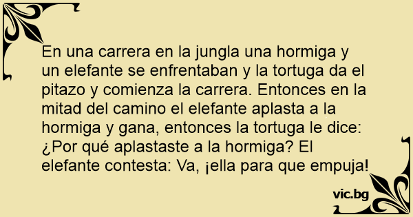 En una carrera en la jungla una hormiga y un elefante se enfrentaban y la tortuga da el pitazo y comienza la carrera. Entonces en la mitad del camino el elefante aplasta a la hormiga y gana, entonces la tortuga le dice: ¿Por qué aplastaste a la hormiga? El elefante contesta: Va, ¡ella para que empuja!
