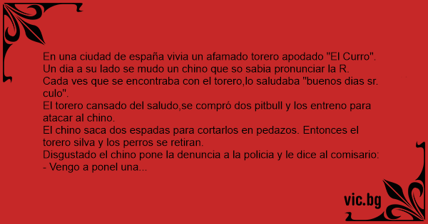 En una ciudad de españa vivia un afamado torero apodado "El Curro". Un dia a su lado se mudo un chino que so sabia pronunciar la R.