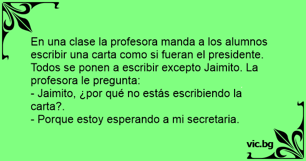 Учениците добиваат состав за писмена работа: "Што би направиле доколку сте директор"? Сите ученици пишуваат само малиот Трпе седи и чека. Учителката налутено го прашува: - Зошто не пишуваш? - Чекам да дојде секретарката да и издиктирам.