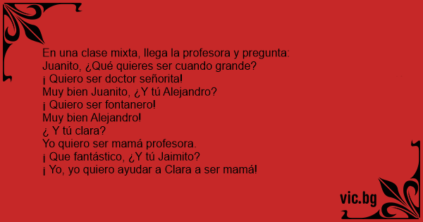Clase mixta. El maestro pregunta a sus alumnos qué quieren hacer de mayores: - Dime tú, Roberto. - Ingeniero, señor profesor. -¿ Y tú, Carlos? - Fontanero, señor profesor. -¿ Y tú, Claro? - Yo...