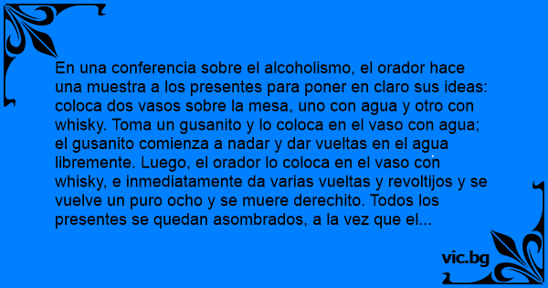En una conferencia sobre el alcoholismo, el orador hace una muestra a los presentes para poner en claro sus ideas: coloca dos vasos sobre la mesa, uno соn agua y otro соn whisky. Toma un gusanito y lo coloca en el vaso соn agua; el gusanito comienza a nadar y dar vueltas en el agua libremente. Luego, el orador lo coloca en el vaso соn whisky, e inmediatamente da varias vueltas y revoltijos y se vuelve un puro ocho y se muere derechito. Todos los presentes se quedan asombrados, a la vez que el orador dice: