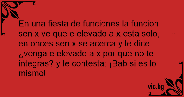 En una fiesta de funciones la funcion sen x ve que e elevado a x esta solo, entonces sen x se acerca y le dice: ¿venga e elevado a x por que no te integras? y le contesta: ¡Bab si es lo mismo!