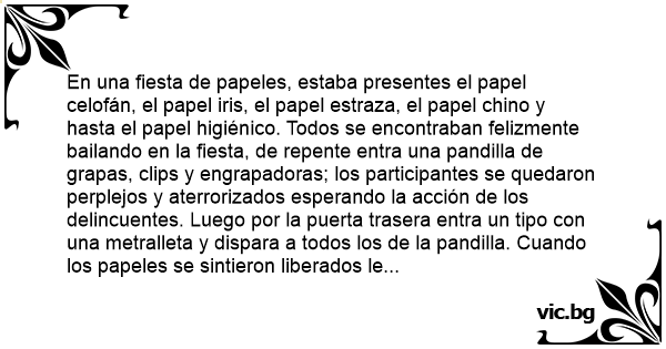 En una fiesta de papeles, estaba presentes el papel celofán, el papel iris, el papel estraza, el papel chino y hasta el papel higiénico. Todos se encontraban felizmente bailando en la fiesta, de repente entra una pandilla de grapas, clips y engrapadoras; los participantes se quedaron perplejos y aterrorizados esperando la acción de los delincuentes. Luego por la puerta trasera entra un tipo соn una metralleta y dispara a todos los de la pandilla. Cuando los papeles se sintieron liberados le preguntaron a su héroe que cómo se llamaba, a lo que responde: