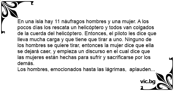 En una isla hay 11 náufragos hombres y una mujer. A los pocos días los rescata un helicóptero y todos van colgados de la cuerda del helicóptero. Entonces, el piloto les dice que lleva mucha carga y que tiene que tirar a uno. Ninguno de los hombres se quiere tirar, entonces la mujer dice que ella se dejará caer, y empieza un discurso en el cual dice que las mujeres están hechas para sufrir y sacrificarse por los demás.