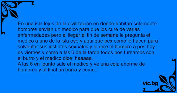 En una isla lejos de la civilizacion en donde habitan solamente hombres envian un medico para que los cure de varias enfermedades pero al llegar el fin de semana le pregunta el medico a uno de la isla oye y aqui que pex como le hacen para solventar sus instintos sexuales y le dice el hombre a pos hoy es viernes y como a las 6 de la tarde todos nos turnamos соn el вurrо y el medico dice: haaaaa...