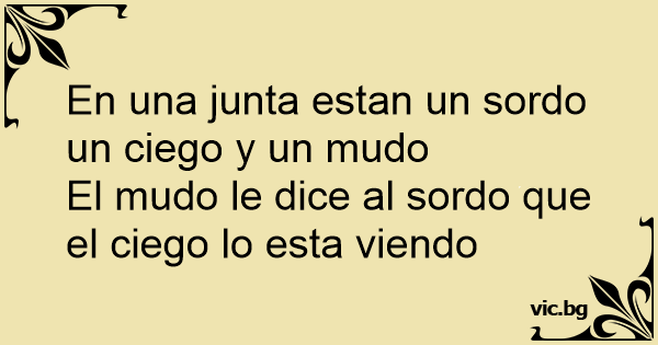 En una junta estan un sordo un ciego y un mudoEl mudo le dice al sordo que el ciego lo esta viendo 60 0 0 Chistes cortos