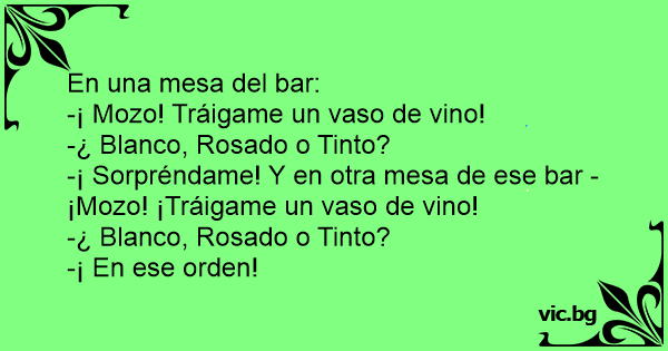 -¡ Sorpréndame! Y en otra mesa de ese bar -¡Mozo! ¡Tráigame un vaso de vino!