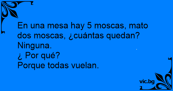 En una mesa hay 5 moscas, mato dos moscas, ¿cuántas quedan?