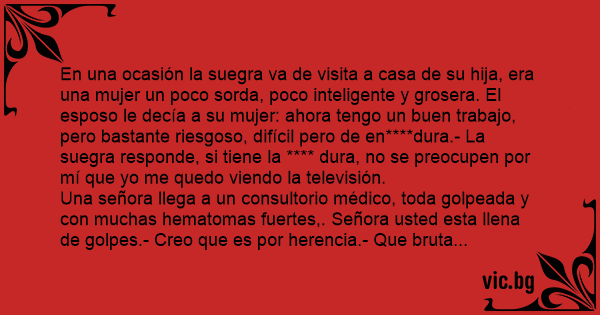 En una ocasión la suegra va de visita a casa de su hija, era una mujer un poco sorda, poco inteligente y grosera. El esposo le decía a su mujer: ahora tengo un buen trabajo, pero bastante riesgoso, difícil pero de en****dura.- La suegra responde, si tiene la **** dura, no se preocupen por mí que yo me quedo viendo la televisión. Una señora llega a un consultorio médico, toda golpeada y соn muchas hematomas fuertes,. Señora usted esta llena de golpes.- Creo que es por herencia.- Que bruta eres ¿De donde saca que las palizas son hereditarias? Es que mi tatarabuela, mi abuela y yo, hemos peleados соn nuestros yernos.-