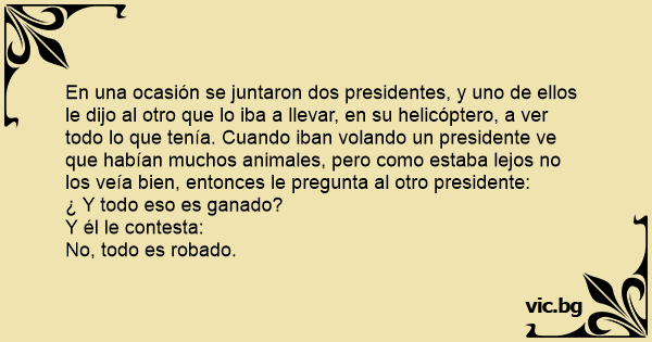 En una ocasión se juntaron dos presidentes, y uno de ellos le dijo al otro que lo iba a llevar, en su helicóptero, a ver todo lo que tenía. Cuando iban volando un presidente ve que habían muchos animales, pero como estaba lejos no los veía bien, entonces le pregunta al otro presidente: