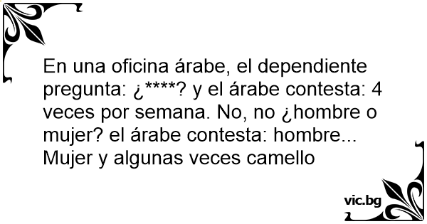 En una oficina árabe, el dependiente pregunta: ¿****? y el árabe contesta: 4 veces por semana. No, no ¿hombre o mujer? el árabe contesta: hombre... Mujer y algunas veces camello