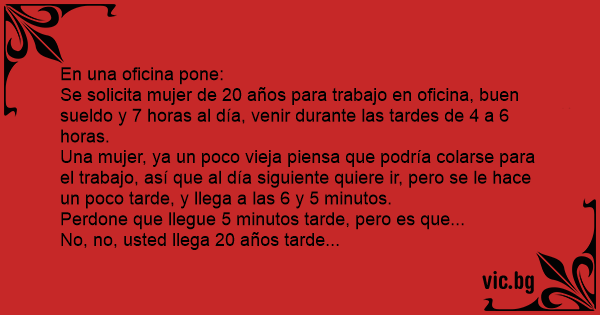 En una oficina pone: Se solicita mujer de 20 años para trabajo en oficina, buen sueldo y 7 horas al día, venir durante las tardes de 4 a 6 horas. Una mujer, ya un poco vieja piensa que podría colarse para el trabajo, así que al día siguiente quiere ir, pero se le hace un poco tarde, y llega a las 6 y 5 minutos. Perdone que llegue 5 minutos tarde, pero es que... No, no, usted llega 20 años tarde...
