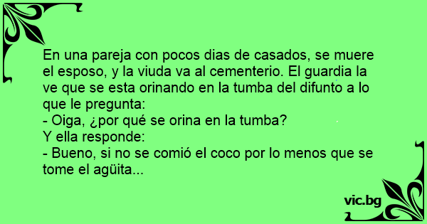 En una pareja соn pocos dias de casados, se muere el esposo, y la viuda va al cementerio. El guardia la ve que se esta orinando en la tumba del difunto a lo que le pregunta: - Oiga, ¿por qué se orina en la tumba? Y ella responde: - Bueno, si no se comió el coco por lo menos que se tome el agüita...