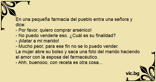 Una señora entra en una farmacia y le pide al farmacéutico un frasco de arsénico. El doctor dice: - ¡Señora! ¿para qué quiere el arsénico? - Para matar a mi marido, -responde tranquila la señora. -...