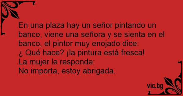 En una plaza hay un señor pintando un banco, viene una señora y se sienta en el banco, el pintor muy enojado dice: